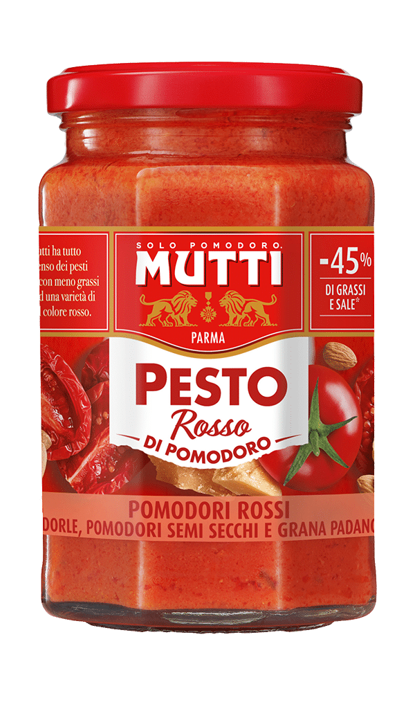 Pesto Rosso di pomodoro Mutti is a simple but tasty novelty: all the intense flavour of traditional pestos but with 45% less fat and salt than the average of the best-selling pestos on the market*, due to the presence in the recipe of a particular variety of coloured tomato. This is due to the use of a special coloured tomato variety in the recipe. It is thanks to the use of red tomatoes (54%) that we have been able to limit the use of oil and salt and offer you a tasty and flavourful pesto that is also lighter. It is enriched with semi-dried tomatoes, Grana Padano PDO and almonds. Discover the other flavours in the range!