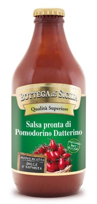 A "Salsa di pomodorino datterinmo" utiliza apenas os melhores produtos e preserva o sabor tradicional da iguaria típica da Sicília.