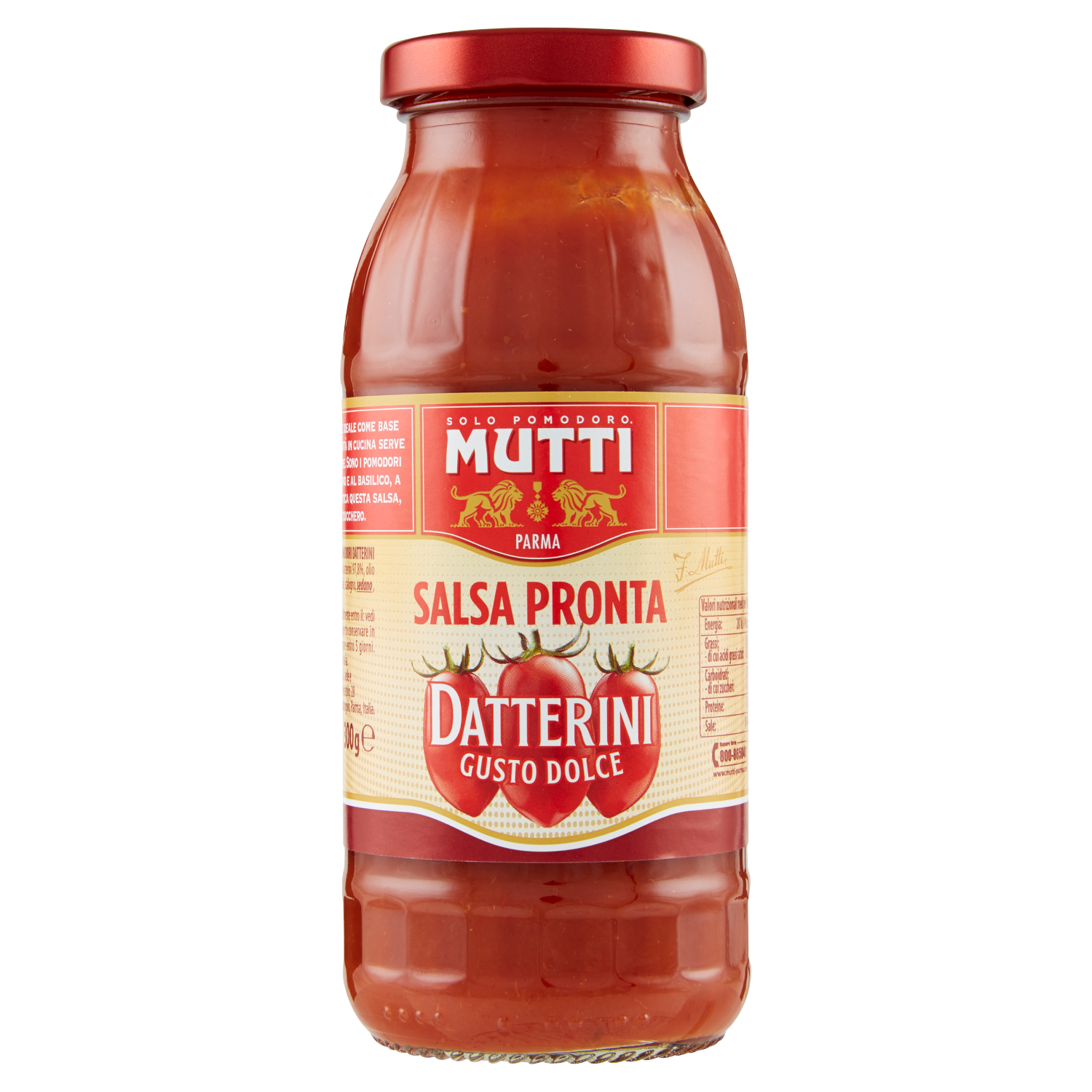 Mutti Datterini Ready Sauce é ideal como base para quando a sua criatividade na cozinha precisa de um sabor doce para começar. Os tomates Datterini, tomates muito saborosos com a sua forma alongada inconfundível, juntamente com chalotas e manjericão, tornam este molho tão doce e aromático, sem adição de açúcar. Um molho aveludado com um sabor bem equilibrado, é ideal para cozedura curta e como molho base para massas secas e de ovos e cereais como a quinoa e arroz branco. É também excelente com queijos encorpados, legumes e delicadas carnes brancas. Como não se apaixonar pela sua doçura!